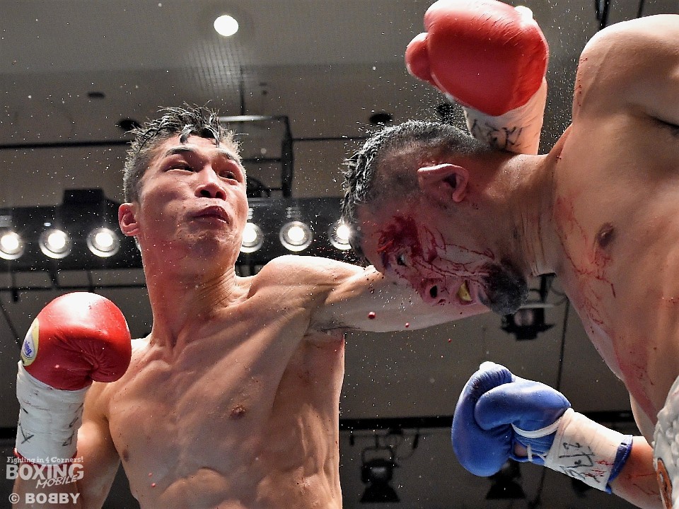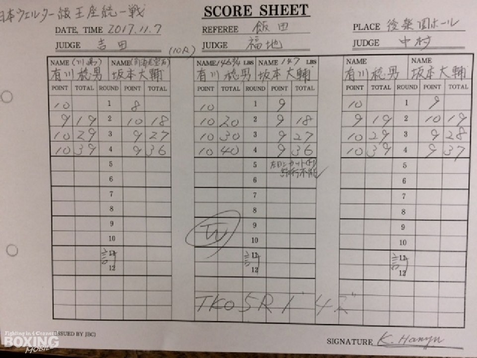 リズムを掴んだ有川は右クロスを決めて膝をつかせたがレフェリーはスリップと判断。2回、有川は右フックで腰を沈めると、プレスをかけて攻勢。先手を取られた坂本だが、ラウンド終盤に右フックをヒットしで会場を盛り上げた。スリリングな打ち合いが続いたが、4回に有川はボディに狙いを定めると、ガードが空いたところに右フックを叩き込みダメージを与えた。試合を優勢に進めた有川は5回、右ストレートで坂本の左目上を切り裂いた。出血激しく1回目のドクターチェックで試合続行不能となり有川がTKO勝ちを収めた。