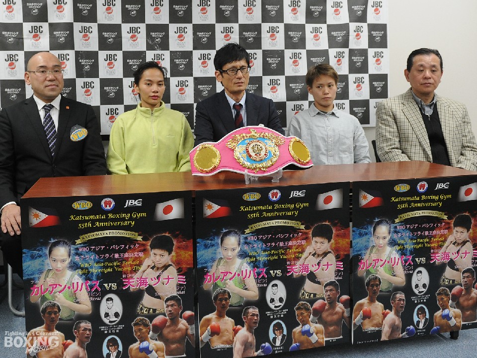 今年で設立55週年を迎える勝又ジムの記念イベントが明日29日に後楽園ホールで開催されるが、そのメインで予定されるWBO女子アジアパシフィック・ライトフライ級王座決定戦、天海ツナミ(33=アルファ)vsカレアン・リバス(28=比)の会見が、前日計量とともに都内の日本ボクシングコミッション本部事務局で行われた。
