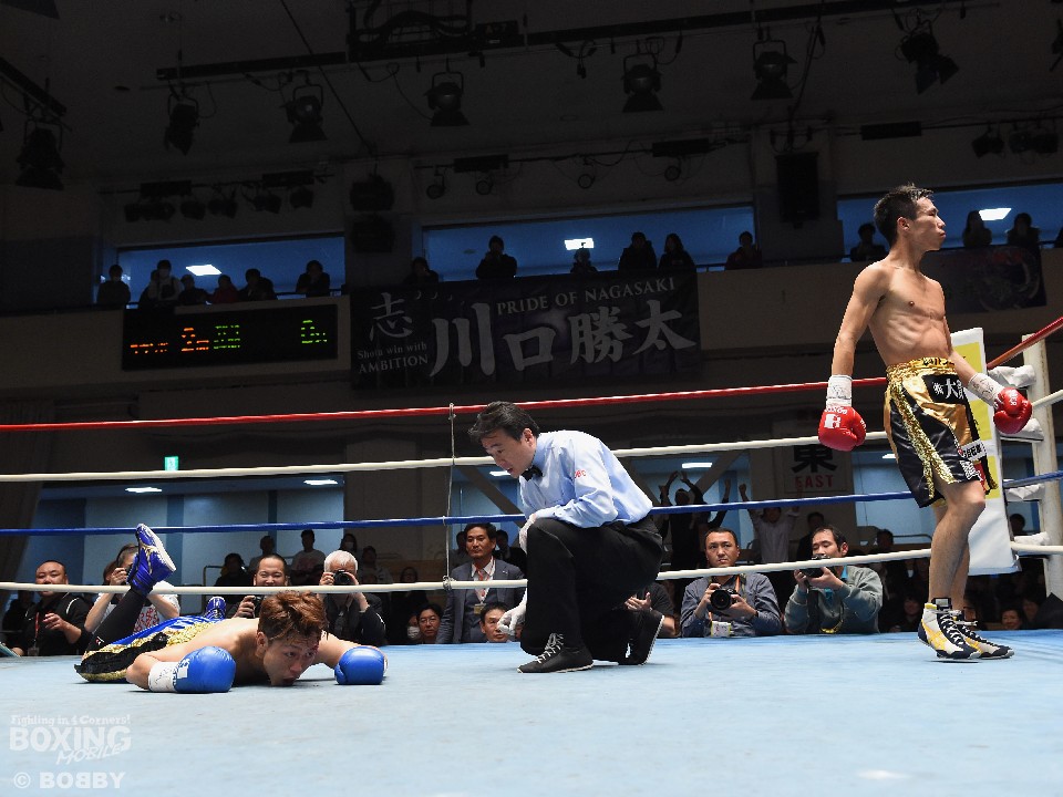 船井がジャブを飛ばしながらワンツーを狙うのに対し、川口は飛び込んで右を当てにいく形でスタート。初回、川口は偶然のバッティングで左目上をカット。2ラウンド終盤、船井は相手の左に右ストレートを合わせ膝をガクッと落とすと、さらに打ち下ろしの右をテンプルに決めて痛烈なダウンを演出。立ち上がろうとした川口だったが、ダメージが深くふらついたところでレフェリーが試合を止めた。船井が豪快なノックアウト勝ちで2度目の防衛に成功した。