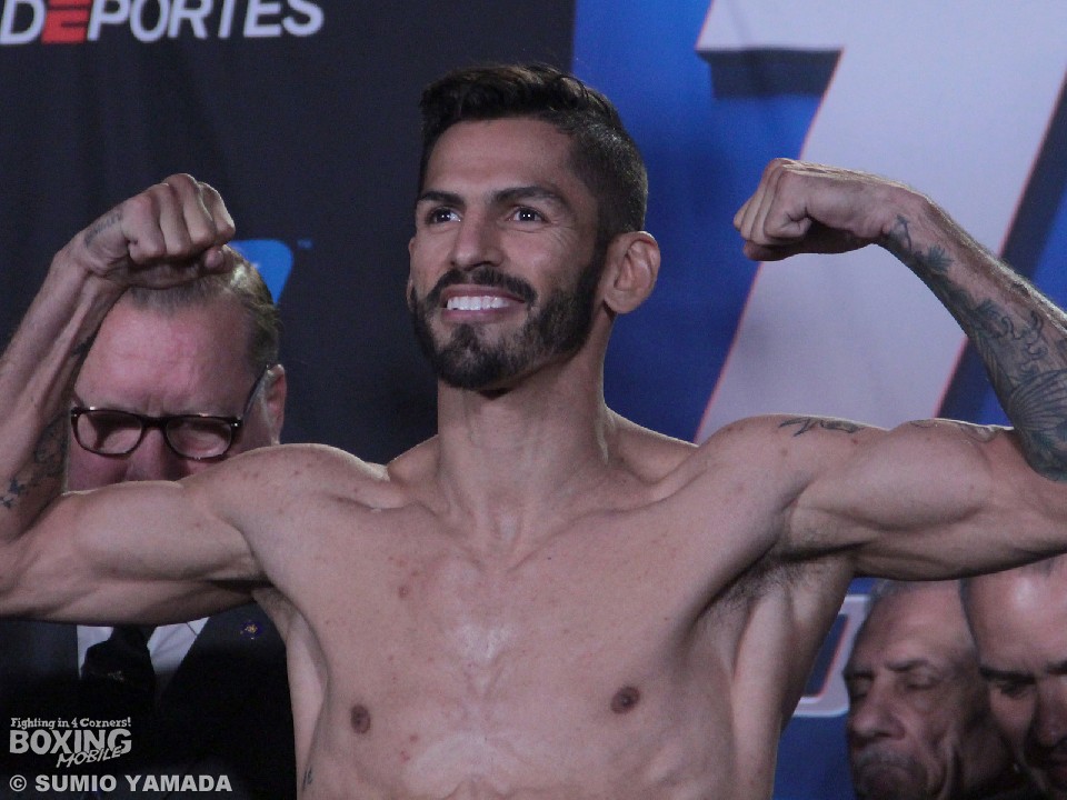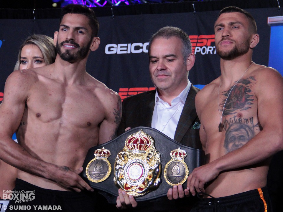これが4度目の防衛戦となる3階級制覇王者のリナレス、勝てば史上最速12戦目で3階級制覇となるロマチェンコ、ふたりとも計量は134.6ポンド(約61.0キロ)だった。「ロマチェンコが無敵ではないということを明らかにする」と防衛に自信をみせるリナレスは47戦44勝(27KO)3敗。「リナレスが優れた選手であることは認めるが、試合後にはこれまでの選手と同じような言い訳をすることになるだろう」と話すロマチェンコは11戦10勝(8KO)1敗。オッズは依然として9対1で挑戦者有利が続いている。プロに転向してから最重量で戦うサウスポーのロマチェンコが、これまでと同じように動けるのかどうか要注目だ。