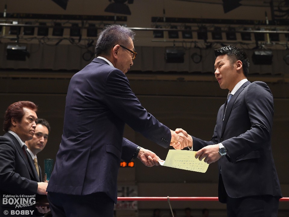 関西勢から唯一選出された矢田は、日本ウェルター級王者の有川稔男(川島)を8回TKOで撃破しての殊勲賞。「強いチャンピオンに勝ったことで自信は確信に変わりました。8月11日の初防衛戦をクリアし、さらに強いチャンピオンになります。浪速のターミネーターをよろしくお願いします」と力強い挨拶でホールのボクシングファンにアピールした。