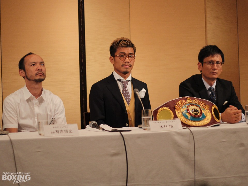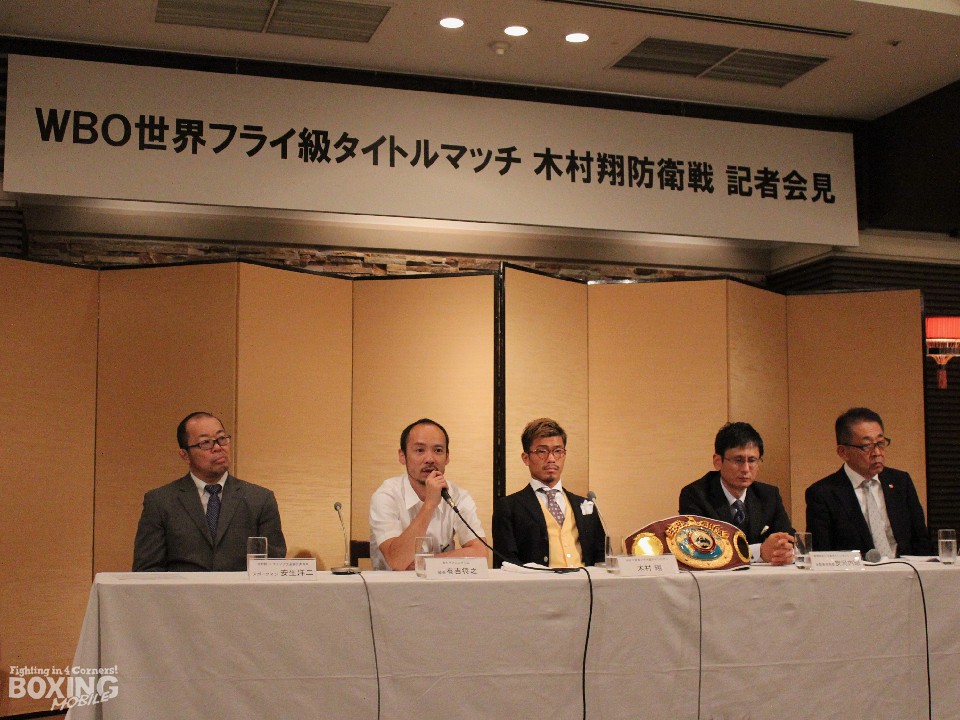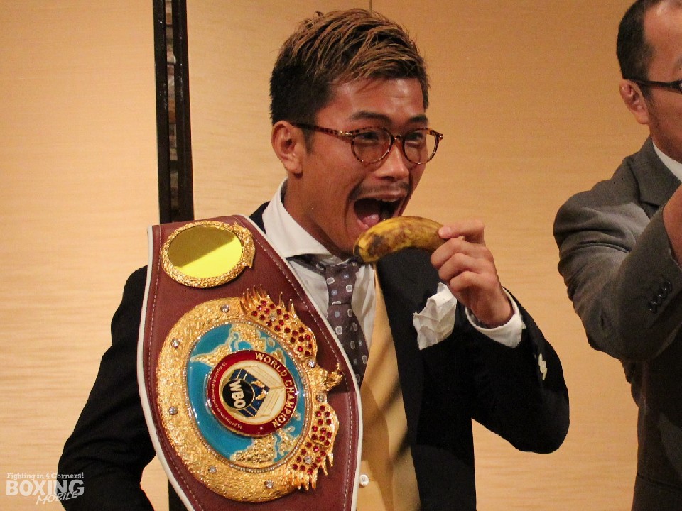 WBO(世界ボクシング機構)フライ級王者の木村翔(29=青木)が19日、都内のホテルで次戦の発表会見を開いた。木村は7月27日(金)、中華人民共和国・青島(チンタオ)体育センター(1万人収容)で同級4位のフローイラン・サルダール(29=比)を迎えて2度目の防衛戦に臨む。木村は会見後のフォトセッションの前に元プロレスラーでチャイナ大会実行委員会スポークスマンの安生洋二氏から皮ごと食べられる「ともいきバナナ」をプレゼントされた。
