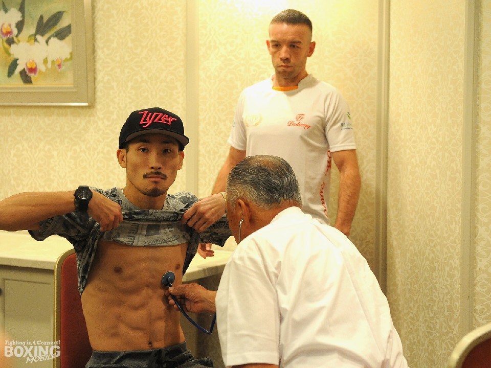 帽子にTシャツとカジュアルな姿で会場入りした岩佐は、検診後にドヘニーと向き合い握手をかわした。その後の会見では落ち着いた表情で「減量は順調だし、疲れも抜けている」と万全の仕上がりをアピール。挑戦者については「予想よりも小さかっただけで、ほかに印象はない」と気のない素振りを見せたが、3月の初防衛戦の検診より身長で0.5p、リーチで1p伸びたことを指摘されると、「戦い方が変わるわけじゃないが、まだ成長していますね」と笑顔を見せ、「無敗の最強挑戦者に勝つことで、またひとつ強くなるはず。全力で戦い勝つだけ」と意気込んだ。