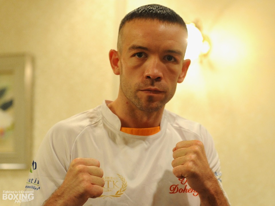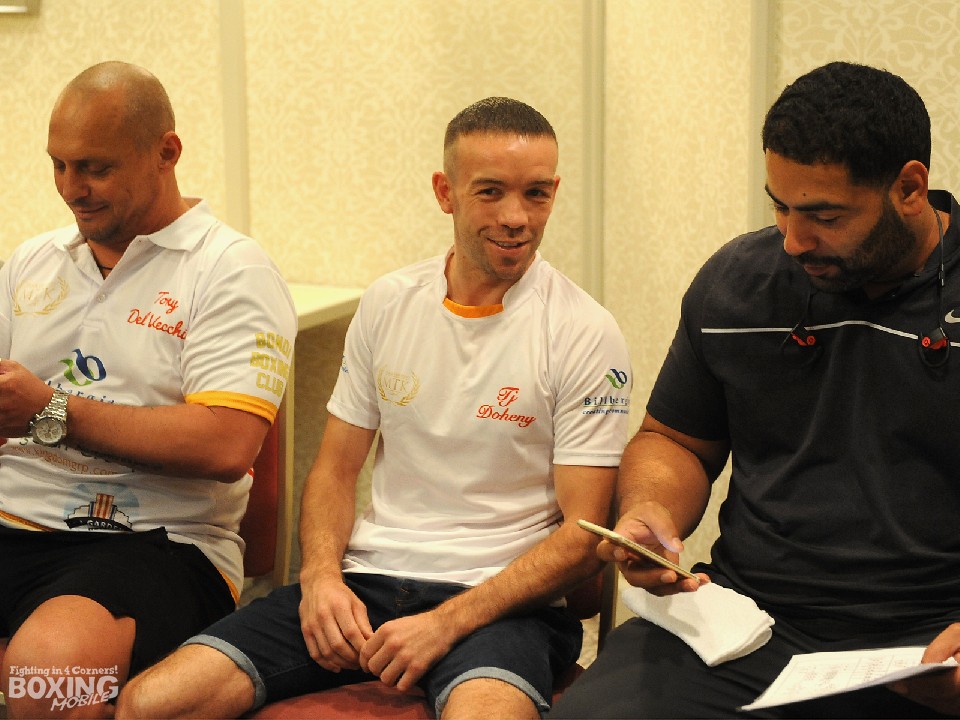 続いて会見に応じた初来日のドヘニーは初の世界戦にも緊張した様子はなく、サービス精神たっぷりにカメラマンにポーズを決めていた。ベクター・ベルンデストレーナー、トニー・トレーナーと並んで着席したドヘニーは、「メンタル、フィジカルとも100%。あとはリングの上で実力を発揮するだけ」と切り出すと、岩佐の印象を聞かれ「岩佐は思っていたほど大きくなく、とても謙虚に感じた。リーチは8.5p不足しているが、その分はパワーで補う」と積極的なファイトを約束。2年前からドヘニーを指導するベクター氏も「リングの上では何が起きてもおかしくはない。我々は多くのゲームプランを持ってきている。あとは結果を出すだけ」と自信を示した。