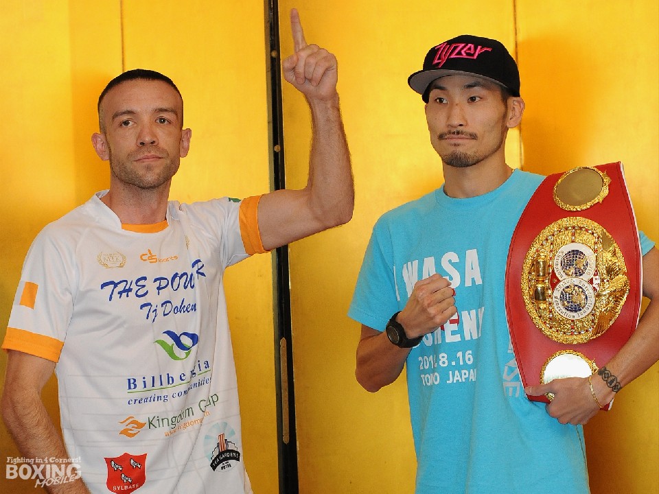 IBF(国際ボクシング連盟)スーパーバンタム級王者の岩佐亮佑(28=セレス)が、明日16日の東京・後楽園ホールで指名挑戦者のTJ・ドヘニー(31=豪/アイルランド)を迎え2度目の防衛戦に臨む。その調印式が「終戦の日」に都内のホテルで行われ、心境を問われた岩佐は「非常にリラックスしている」、「完璧な勝利を目指す!」と力強く防衛を宣言。対する19戦全勝(14KO)と無敗のサウスポー挑戦者は「タイトルを獲る準備はできている」と意気込み、はやる気持ちを押さえていた。