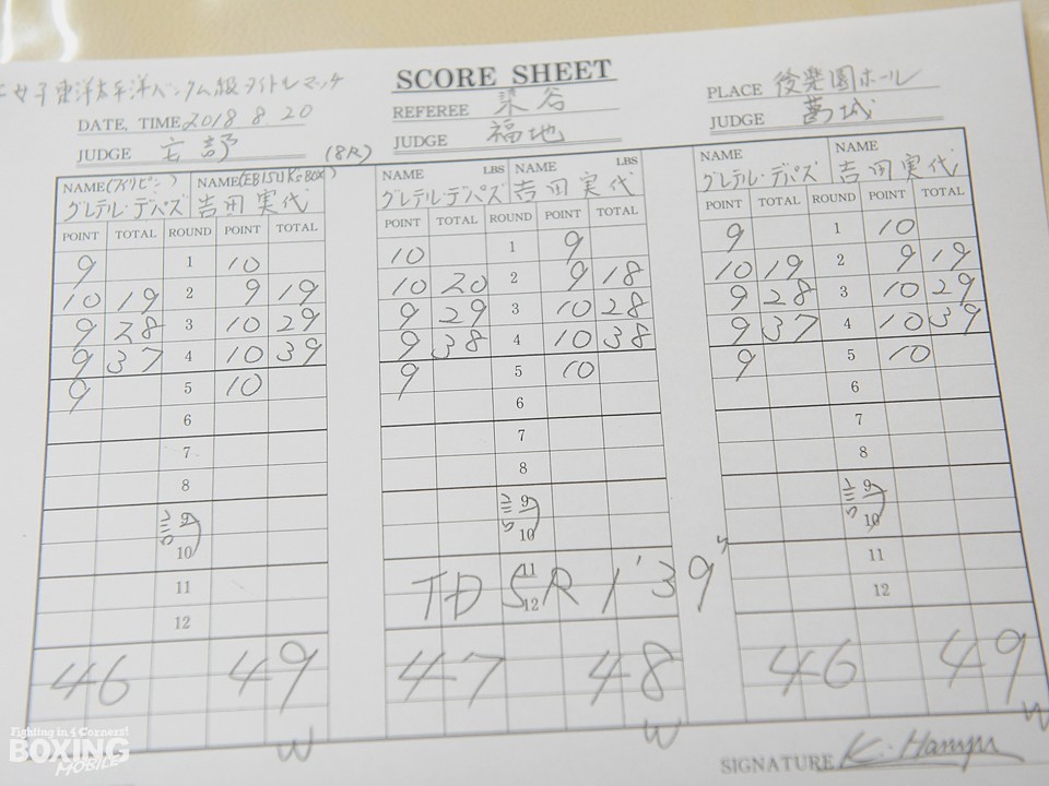 初回は上下に打ち分けるデパズに主導権を握られた吉田だが、2回以降はプレスをかけて右ボディを効かせた。ペースを取り戻した吉田は多彩なパンチでポイントを加点。前半終了時の公開採点は1者が38-38としたが、残りの2者は39-37で吉田がリードした。5回、吉田がさらに攻め立てたところで偶然のバッティング。吉田は左前頭部を負傷し、ここで試合終了となったが、文句なしの負傷判定勝ちで新チャンピオンに就いた。