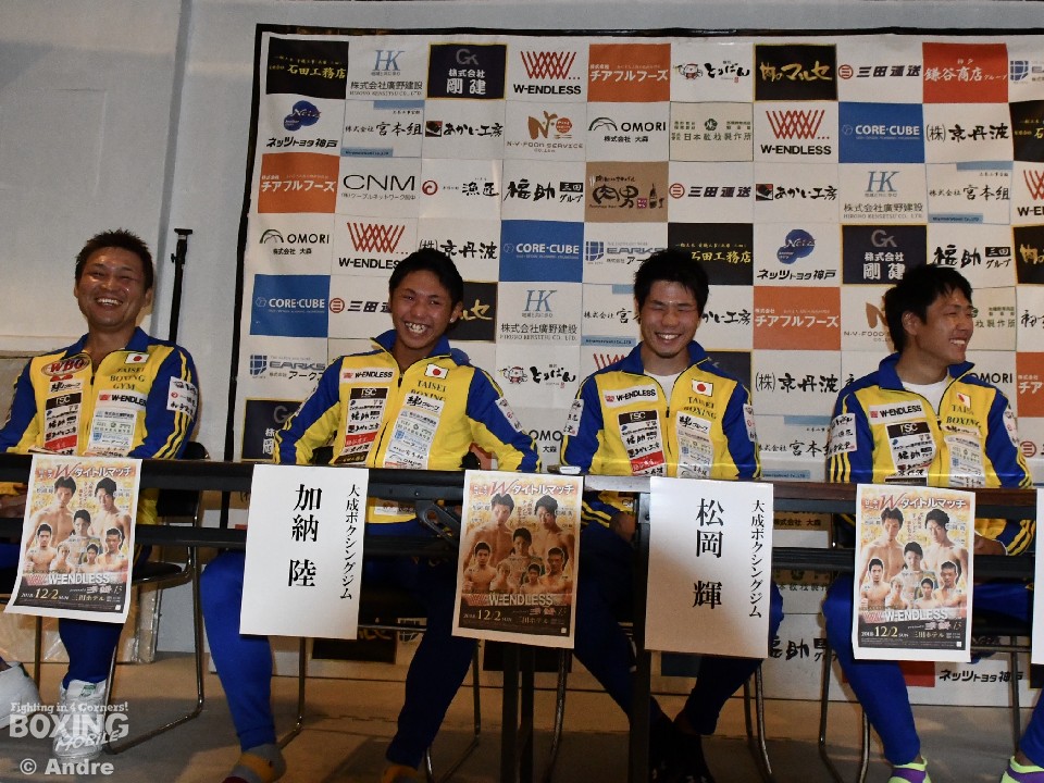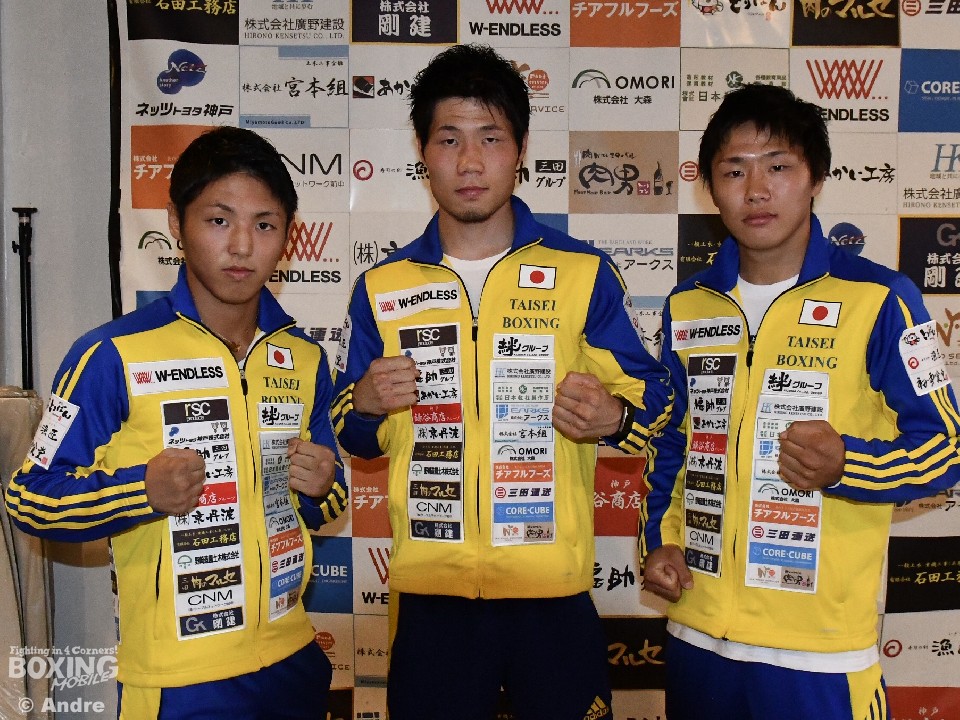 元東洋太平洋ミニマム級暫定王者の加納陸(大成)と、大成ジムが期待をかける松岡輝(ひかる)と松岡新(あらた)の双子ファイターが2日、兵庫県三田市のジムで次戦の発表会見に臨んだ。3選手の試合は12月2日(日)、三田ホテルで開催。加納は、8月の日本タイトルマッチ敗戦からの復帰戦で寺次孝有希(ミサイル工藤)とライトフライ級8回戦、松岡兄弟はダブル日本ユースタイトルマッチとなり、兄の輝はフェザー級王座決定戦で大里登(大鵬)と、弟の新はフライ級王座決定戦で太田輝(五代)を迎えて行われることが発表された。