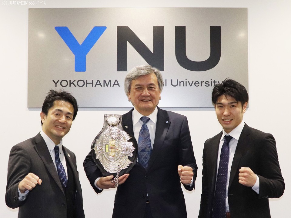 約6年ぶり2度目の世界挑戦が決まったIBF(国際ボクシング連盟)フライ級4位の黒田雅之(川崎新田)が8日、新田渉世会長の母校、横浜国立大学を表敬訪問し、5月13日(月)に挑むIBF王者モルティ・ムザラネ(南アフリカ)戦に向け、長谷部勇一学長に世界王座奪取を誓った。長谷部学長は神奈川県ユニセフ協会の会長も務め、川崎新田ジムは同会が開催するチャリティイベントに毎年参加している。