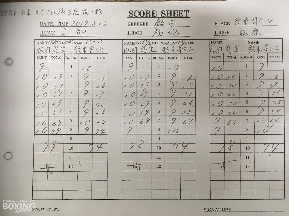 試合は立ち上がり、鈴木が距離を詰めて打ち合いにいくとサウスポー松田もこれに応戦。鈴木のパンチをかわしてはワンツー、右フックを決め、メリハリのある攻撃でペースを握り、4ラウンド終了時の公開採点で39-37×2、40-36×1とリードした。ポイントを挽回したい鈴木は圧力を強めたが、松田は押し込んでは的確にパンチを当て相手の土俵で完封。大差判定勝ちで王座を統一した。