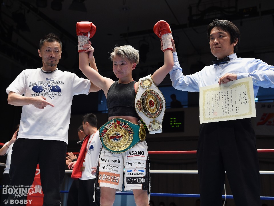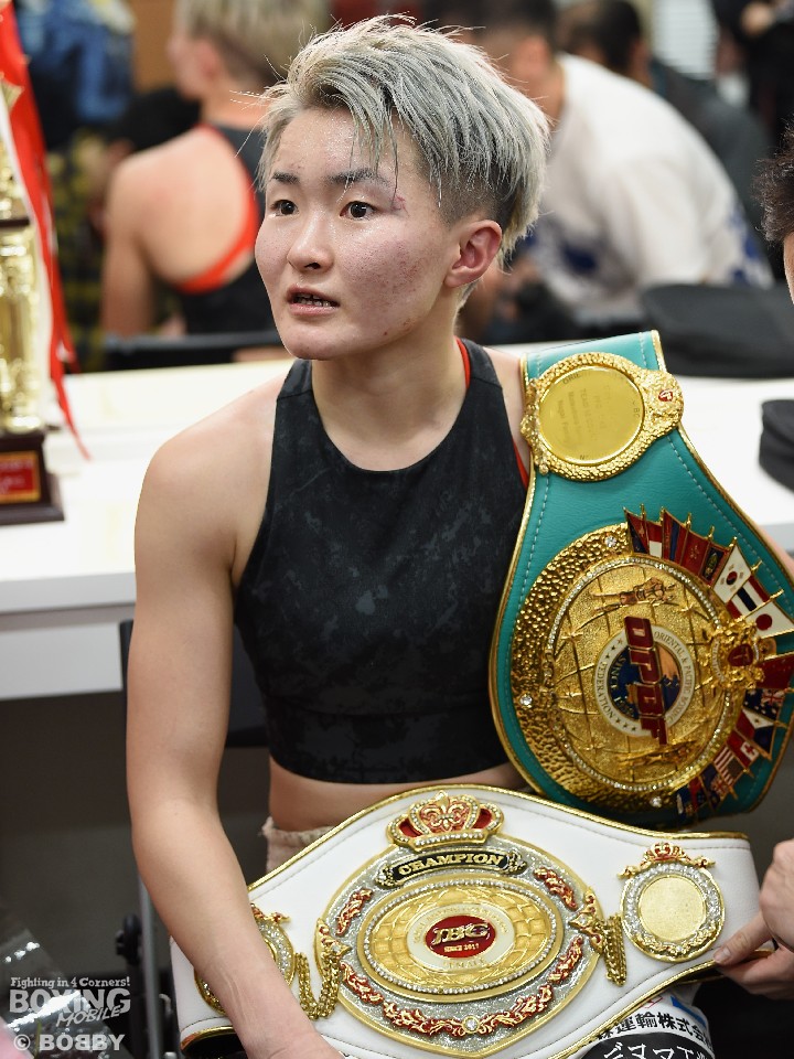 デビューからわずか3戦目で2冠王者に輝いた松田は、「相手はしつこさが武器だと聞いていたので、最後まで気を抜かずに戦った。前回、効果的に使えた右フックが今回も上手くいった。こんなに早く2本のベルトを獲れるとは思っていなかった。自分のこととは思えないです」と満面の笑みを浮かべた。