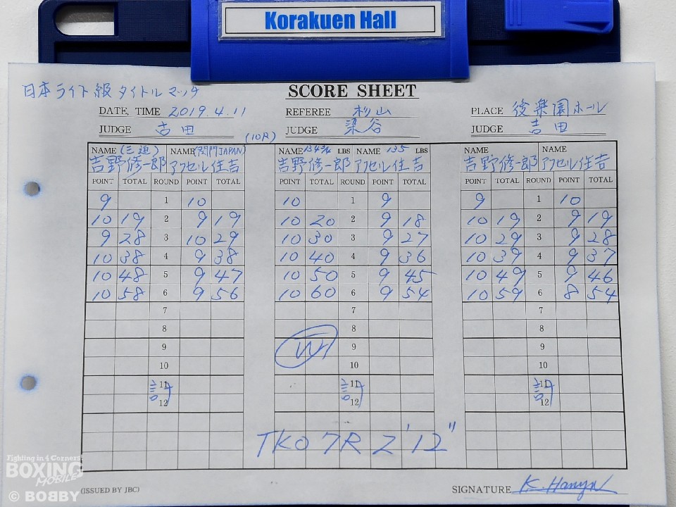 挑戦者らしく積極的に左を突く住吉を冷静に対処した吉野は、左を返し様子を伺う。2回、吉野はプレスをかけながら丁寧に左から組み立てるが住吉も真っ向から応戦。吉野は鉄壁のガードで被弾を回避し、左を軸に多彩な攻撃で攻め立てた。住吉は左目上を腫らしながらも懸命にパンチを返すが吉野の牙城を崩せず。前半終了時の公開採点を48-47、49-46、50-45で折り返した吉野はプレッシャーを強めて連打で攻勢をかけた。すると7回、吉野は攻撃の手を緩めず追い詰めると、最後は逆ワンツーでダウンを演出。それまでのダメージを考量したレフェリーがノーカウントで試合を止めた。