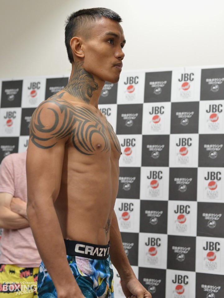 先に秤に乗った山内はリミットちょうどの50.8kgでパスした。山内は今年3月に中国・上海でWBA同級3位のウラン・トロハツ(中国)と空位のWBAインターナショナル・フライ級王座を争い判定負け。2戦連続での世界ランカーへの挑戦に、「前回は初めての外国での試合で、12ラウンドフルに戦い良い経験になった。敗戦を糧に必ず勝ちたい。全力で戦いチャンスがきたら一気に仕留めたい」と必勝宣言した。