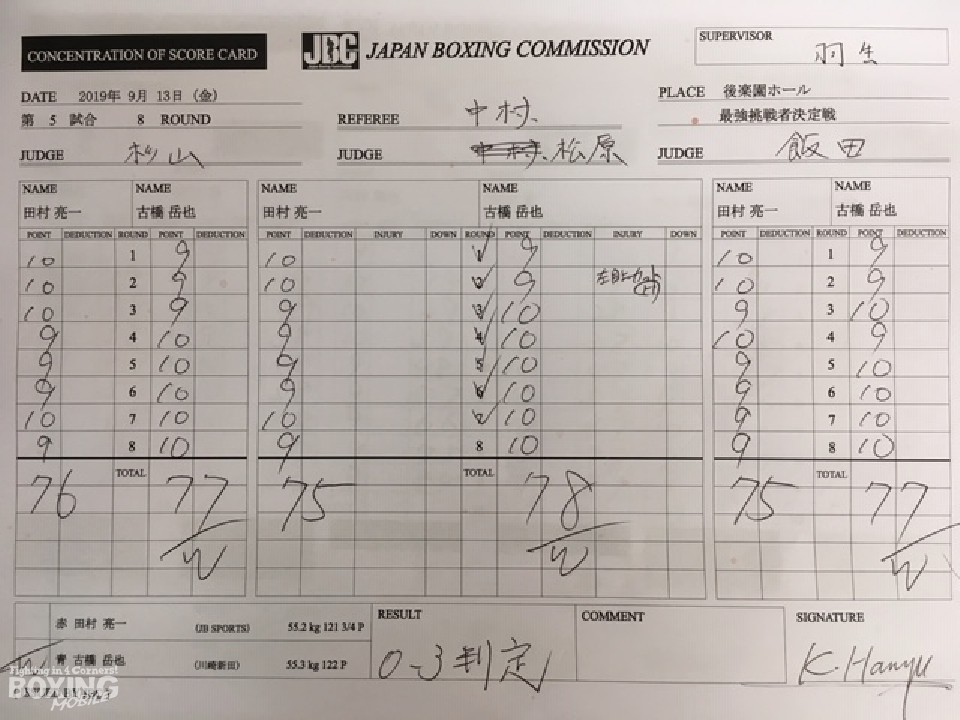 一方、連敗となった田村は、「(採点は)勝ったかなと思ったが、見栄えが悪かったので仕方がない。ボディは効いていないが左フックは効いた」と肩を落とした。