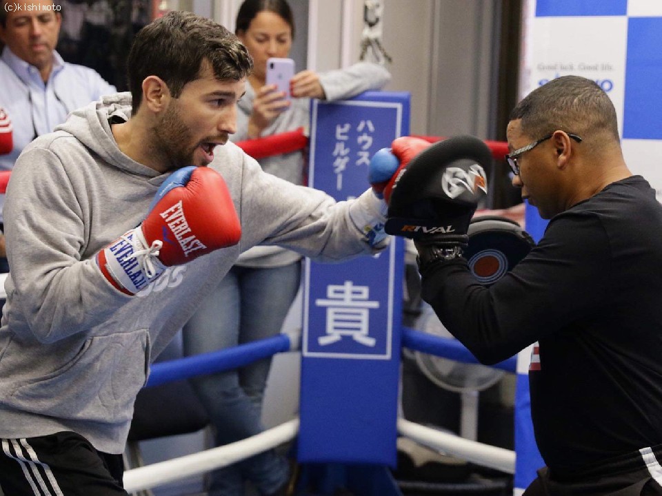 会見後の練習では、2ラウンドのシャドーボクシングの後にミット打ちを2ラウンド披露。左右ともシャープなパンチを打ち込むと、コンパクトな右ショートアッパー、伸びのある左ストレートで快音を響かせた。スラリとした女性のような足の細さが印象的だった。