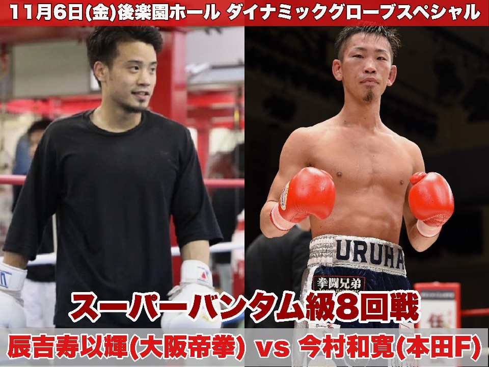 中谷潤人(M・T)の世界初挑戦が行われる11月6日(金)のダイナミックグローブスペシャルを主催する帝拳プロモーションが、セミファイナルに辰吉寿以輝(24=大阪帝拳)が登場することを25日までにネット上で発表した。辰吉が後楽園ホールで試合をするのは2016年10月1日のモンキー修平戦以来4年ぶり。試合はスーパーバンタム級8回戦で行われる。対戦相手は、アマチュア時代に52戦のキャリアを持つエリートボクサー今村和寛(28=本田フィットネス)。今村は昨年3月にプロデビューして、これまで2戦2勝(1KO)。タイトル挑戦も視野に入ってきたプロ叩き上げの辰吉にとっては、真価の問われる大事な試合。辰吉のプロ戦績は13戦全勝(9KO)。
