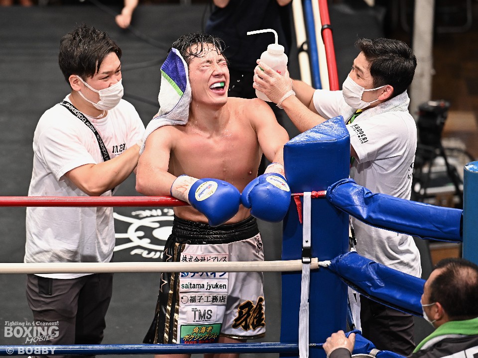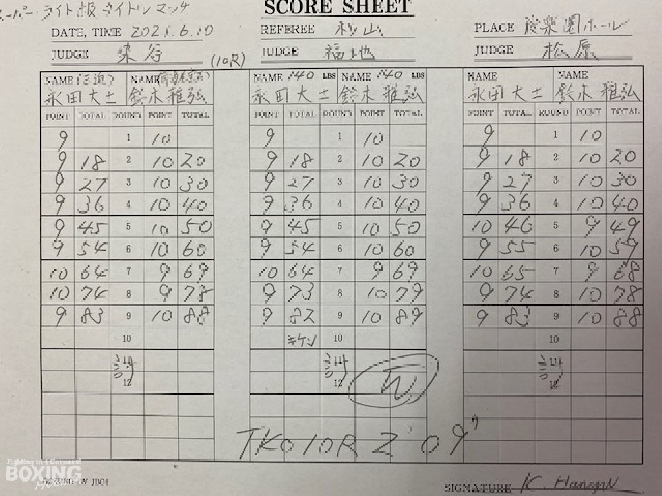サウスポー永田が距離を詰めてくるのに対し、鈴木は左アッパー、左ボディで迎え撃つとワンツーを好打しペースを掌握。鈴木は的確なパンチでダメージを与えると、前半終了時の公開採点で49-46×1、50-45×2と大きくリードした。ポイントで優位に立った鈴木だが、打ち急がずにジャブから左ボディ、右ボディストレートと多彩な攻撃を披露。逆転を狙う永田は7回にボディを効かせたが、ここを踏ん張った鈴木は、その後も着実にポイントを重ねて最終10回にフィニッシュした。鈴木がデビューから6戦目で新王者に就いた。