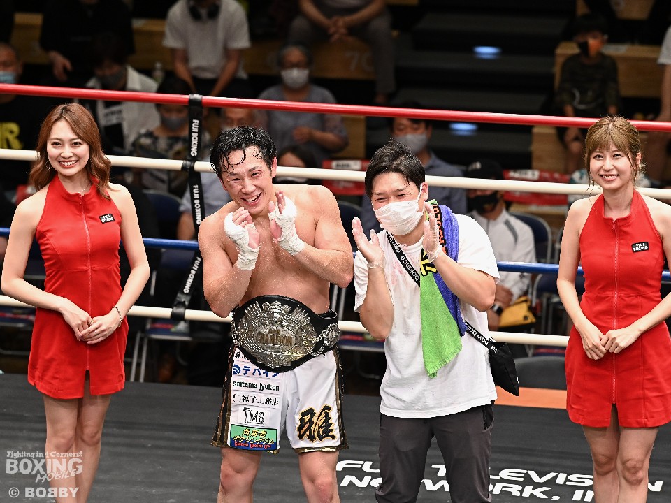 タイトル初挑戦でベルトを巻いた鈴木は「昨日のリモート会見で永田さんは『前に出てくる』と言っていたので、距離を潰してくると思っていた。田部井さん(田部井要トレーナー)が立てた左ボディで迎え撃つ作戦がハマった」と試合を振り返ると、「小学校5年生からボクシングを始めたが、高校、大学と日本一になることができなかったので、やっと一番になることができた。ボクシングをやってきてよかった」と感無量の表情を浮かべた。