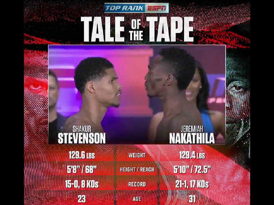 スティーブンソンは、19年10月に空位のWBOフェザー級王座を獲得すると防衛をしないまま返上、階級を上げて2連勝を重ねた。暫定王座ながら2階級制覇を達成しビッグマッチを目論む。世界初挑戦で初めてラスベガスのリングに立つナカティアは、16年11月に敵地ロシアで敗れるもその後は10連続KO勝利でこの暫定王座決定戦のチャンスを掴んだ。
