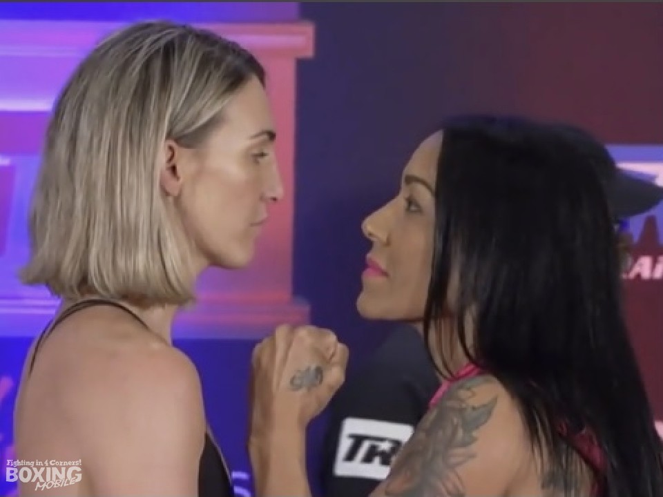 続いて計量台に上がったのがチャンピオンのミカエラ・メイヤー(30=米国)。こちらも129.8lbで一発クリア。挑戦者とは対照的に終始無表情を貫くとフェイスオフでは13cmの身長差を強調するかの如くエリカを見下ろして威圧感を与えた。これに対して挑戦者は、左拳を握ってチャンピオンのアゴの辺りにロックオンして挑発した。