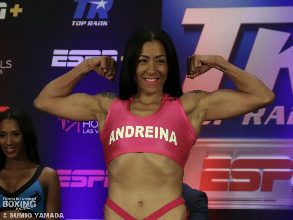 WBO女子世界スーパーフェザー級タイトルマッチの前日計量が日本時間の19日、米国ラスベガスのバージンホテルで行われた。最初に計量台に上がったのはエリカ・アナベラ・ファレナス(36=アルゼンチン)。128.2lbで一発クリアすると笑顔で万全をアピールした。