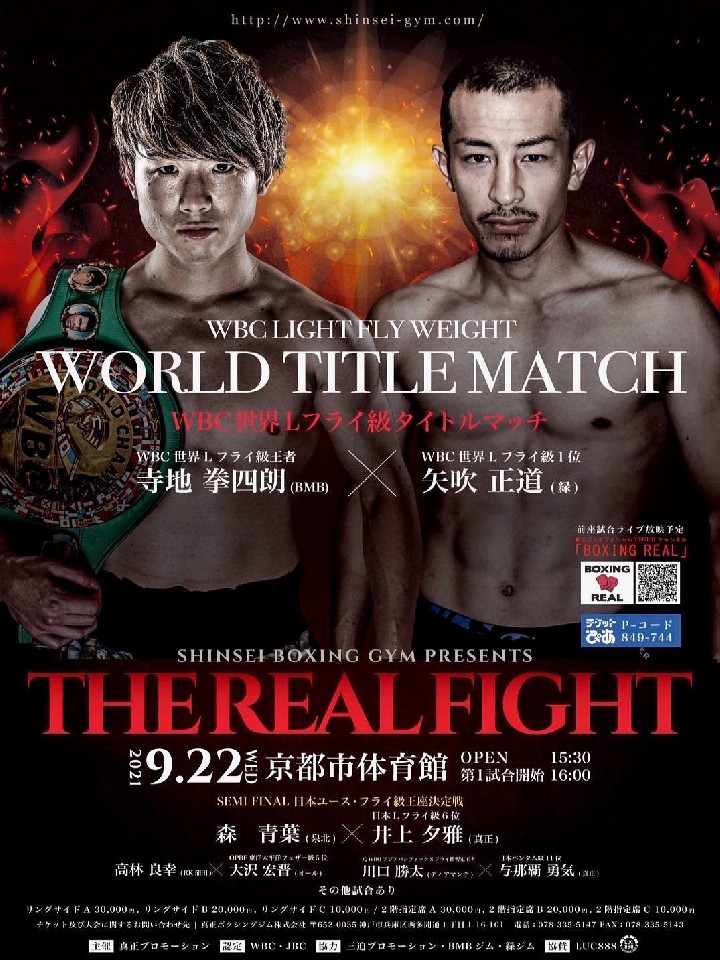 試合をプロモートする真正ボクシングジムは6日、WBC(世界ボクシング評議会)ライトフライ級タイトルマッチ、王者の寺地拳四朗(BMB)対同級1位の矢吹正道(緑)を9月22日(水)(第1試合午後4時開始)に京都市体育館で開催することを発表した。