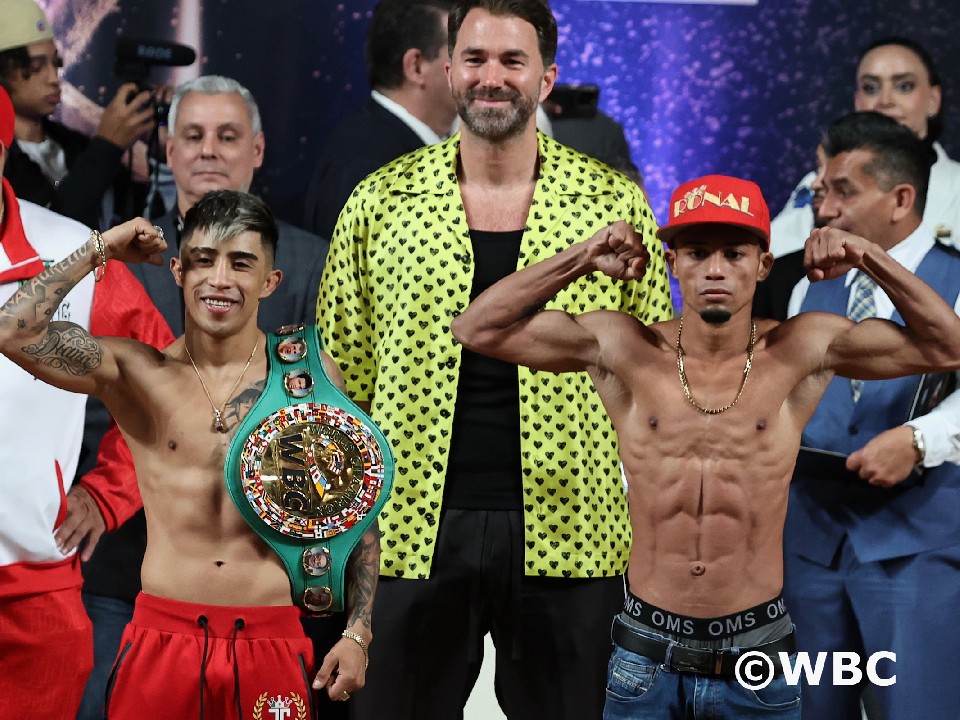 WBC(世界ボクシング評議会)世界フライ級タイトルマッチの前日計量がメキシコ時間の5日、グアダラハラで行われ、チャンピオンのフリオ・セサール・マルチネス・アギュラー(28=メキシコ) と挑戦者のロナル・バチスタ(26=パナマ)は揃って、111.3lb (50.4kg)でクリアした。