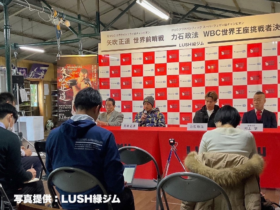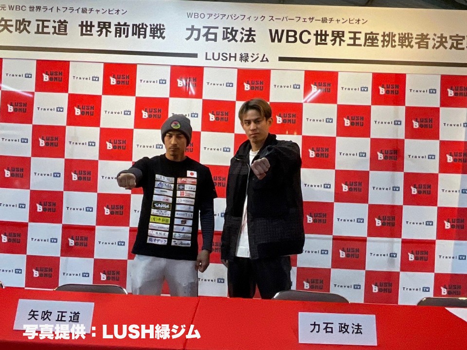 前WBC(世界ボクシング評議会)ライトフライ級王者の矢吹正道(31=LUSH緑)とWBOアジアパシフィックスーパー・フェザー級王者の力石政法(29=LUSH緑)が25日、名古屋市内のジムで開かれた記者会見に出席し、次戦に向けた意気込みを語った。