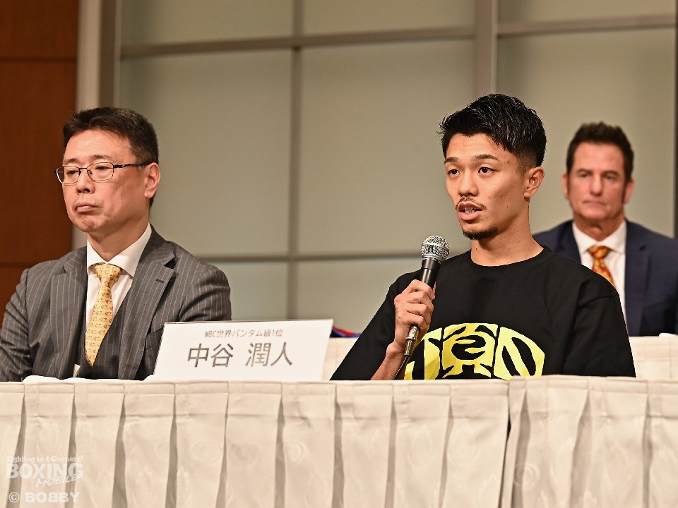 翌日に前日計量を控えての記者会見。中谷の頬はややこけていたものの、顔色が良くスーパーフライ級時代よりコンディションが良いのは明らかだった。「スーパーフライ級(52.1kg)からバンタム級(53.5kg)に上げて、減量がかなり楽になった。1.4kgの幅は(自分にとって)大きい」と万全のコンディションをアピールした。