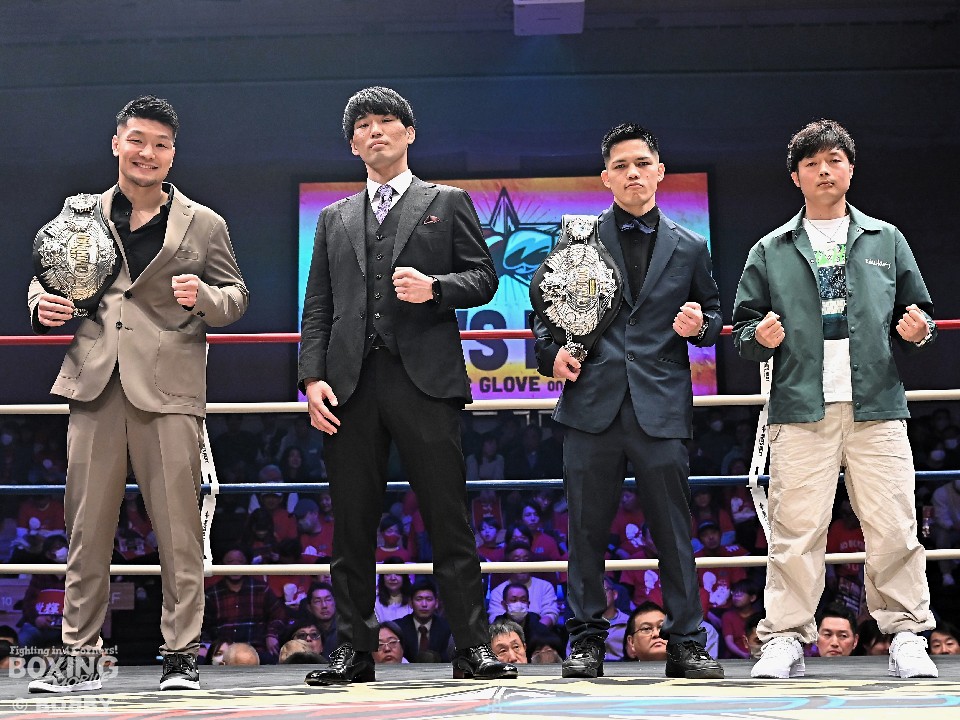 5月4日(土)に後楽園ホールで開催される「WHO'S NEXT DYNAMIC GLOVE on U-NEXT」で行われるダブル日本タイトルマッチで対戦する、ウェルター級王者の坂井祥紀(29=横浜光)と同級1位の豊嶋亮太(帝拳)、ライトフライ級王者の川満俊輝(三迫)と同級1位の安藤教祐(KG大和)の4人が6日、後楽園ホールのリング上から、それぞれの熱い気持ちを伝えた。