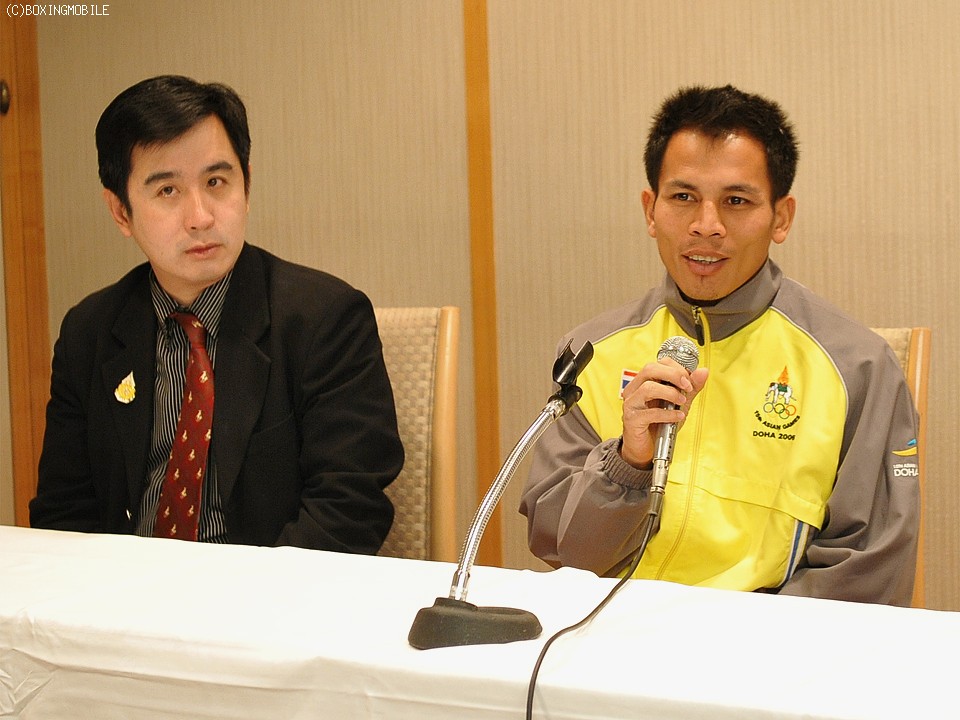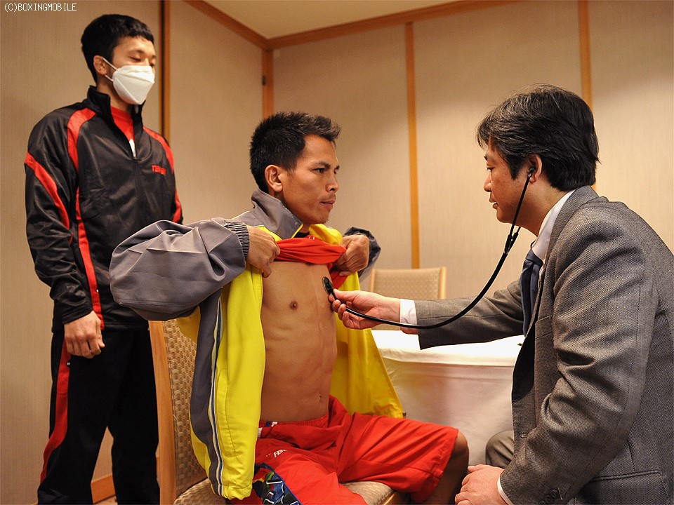 4月6日東京国際フォーラムで開催されるワールドプレミアムボクシングVol.15「The REAL」。決戦を3日後にひかえ、メインとなるWBC世界スーパーフェザー級タイトルマッチに臨む王者・粟生隆寛(帝拳)と挑戦者ターサク・ジャンデーン(タイ)の予備検診が都内ホテルで行われた。