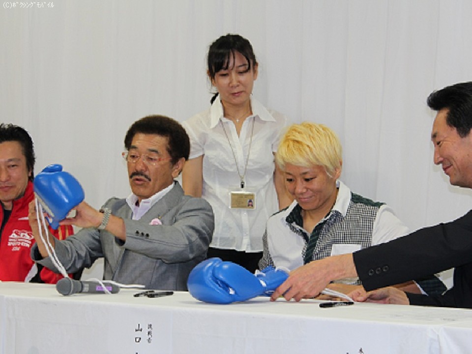 日本製8オンスのグローブが使用される明日の決戦。グローブチェックのポイントを聞かれると「握りやすさで選んだ。」と王者が笑顔を見せると「フィーリング」と挑戦者も微笑みを見せた。