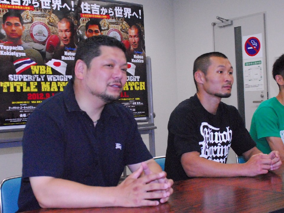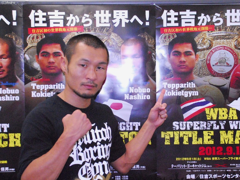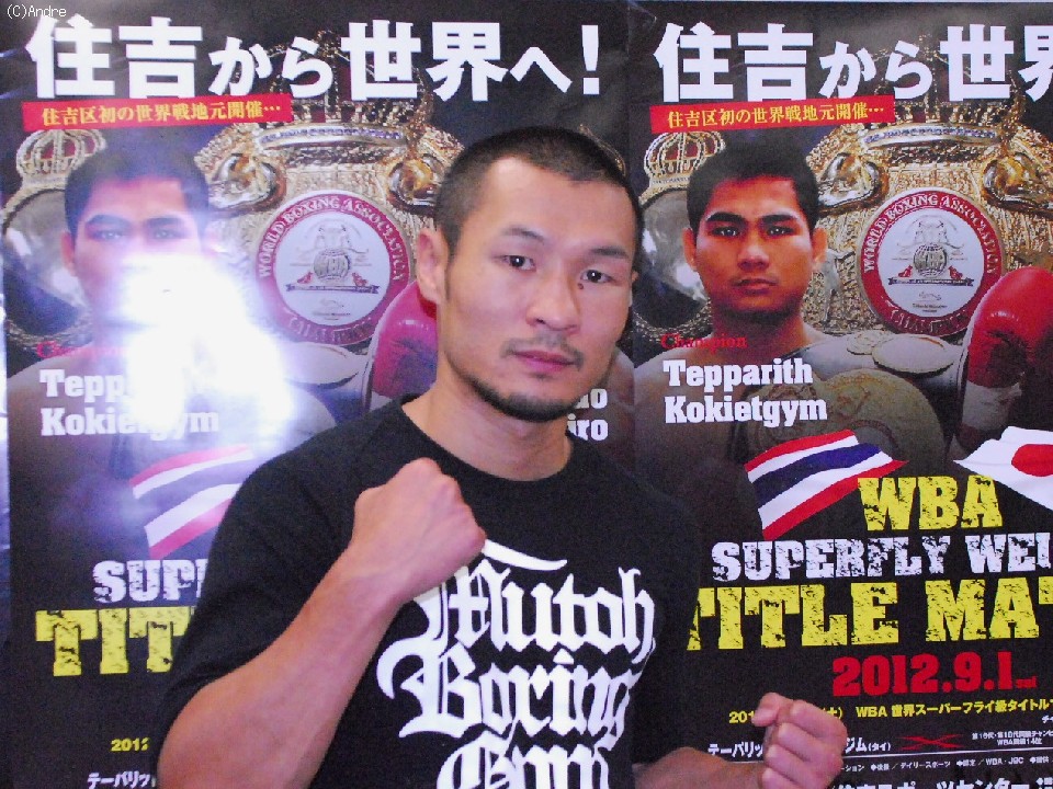 元世界王者名城信男が、WBA世界スーパーフライ級王者・テーパリット・コーキャットジム(タイ)に挑戦することを発表した。決戦は9月1日、場所は地元・住吉スポーツセンター。通常、住吉スポーツセンターではプロボクシングの試合は開催されないが、『住吉区から世界チャンピオンを』という地元住吉区民のバックアップによって、世界戦開催が決定したという。