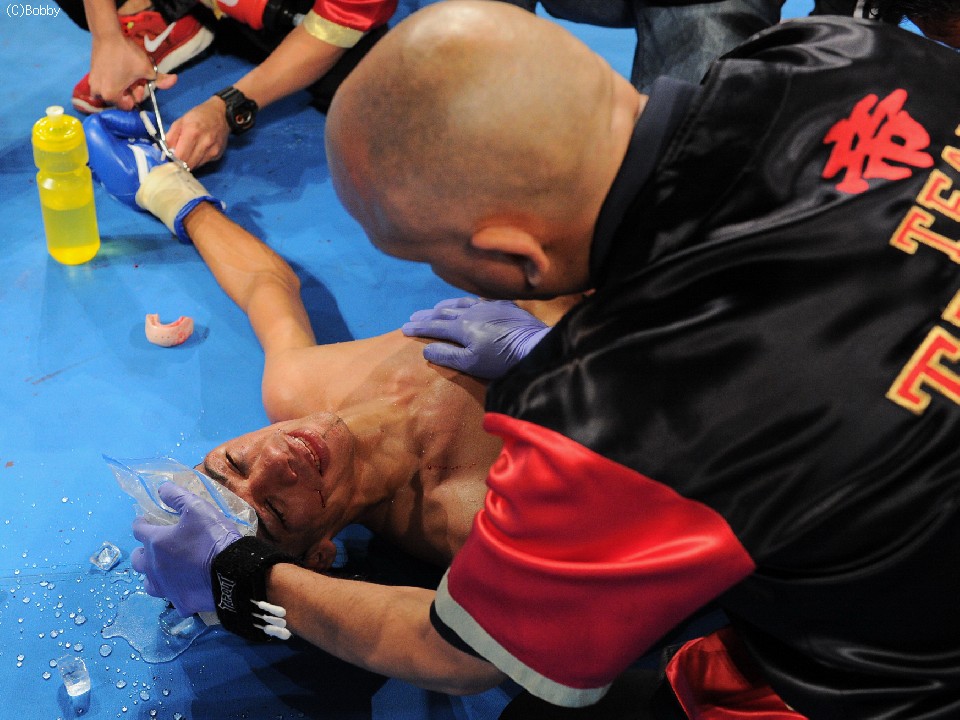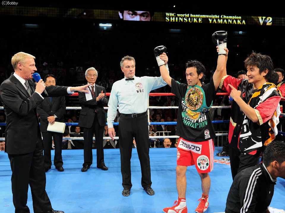 試合が動いたのは7ラウンド36秒。身長とリーチで上回る挑戦者ロハスが射程距離に入ると、王者山中の左ストレートがロハスの頬を捉える。続けて右アッパー、そして止めは強烈な左ストレート。その瞬間、王者の視界からロハスは前のめりに崩れ去った。この日集まった5200人の地元ファンからは歓喜の声―。アッパレ、山中!?