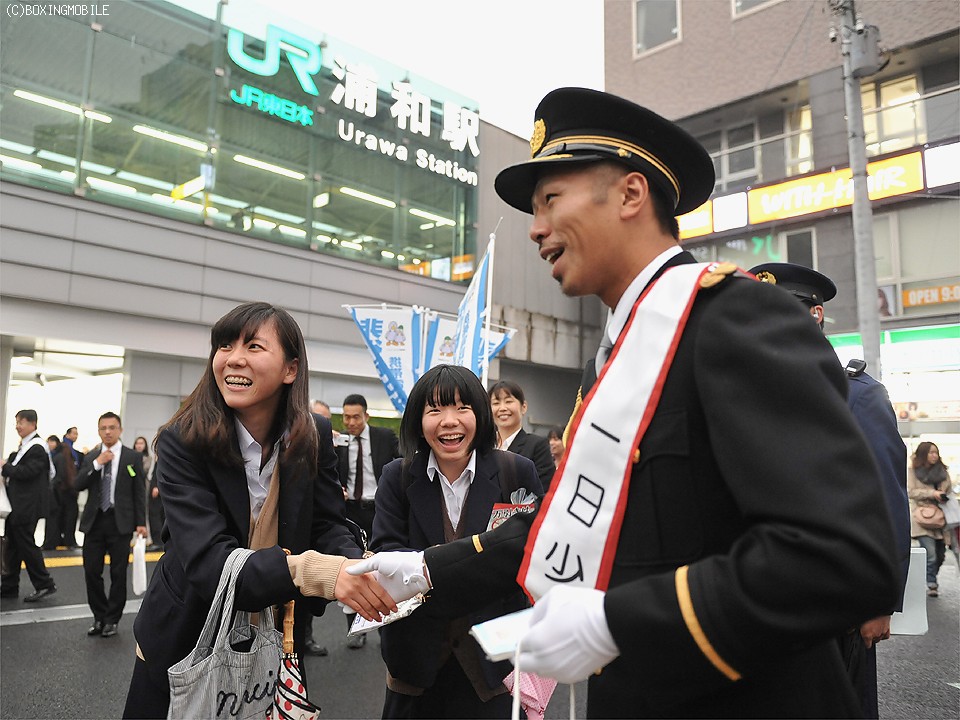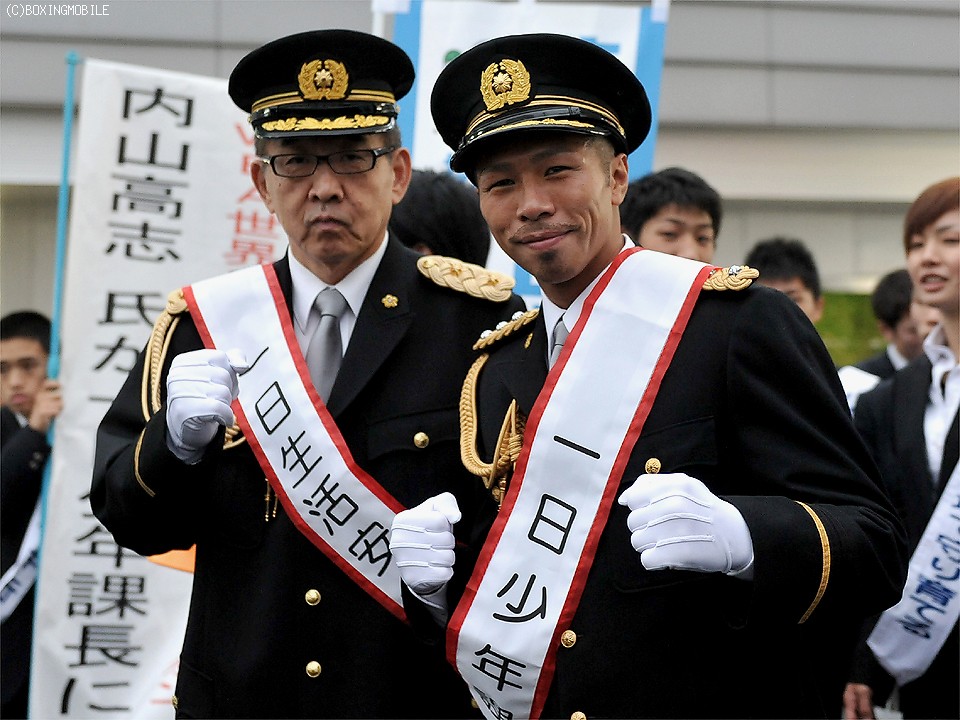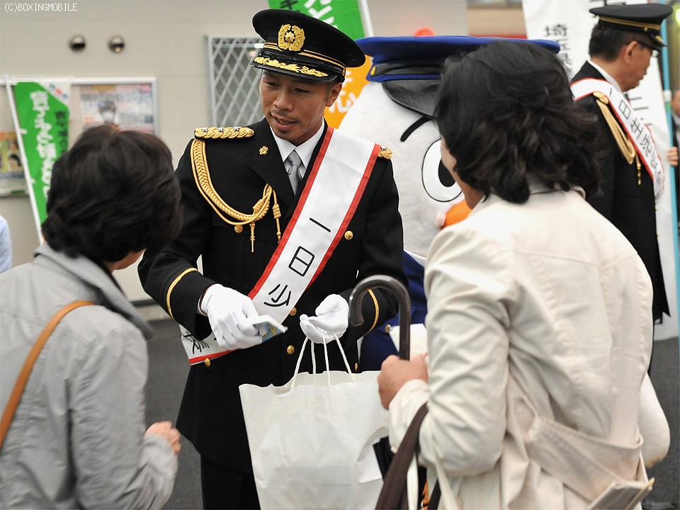 WBA世界スーパーフェザー級王者・内山高志(ワタナベ)が6日、埼玉県さいたま市浦和駅前で行われた埼玉県警主催の非行・万引き防止キャンペーンに一日少年課々長として参加した。