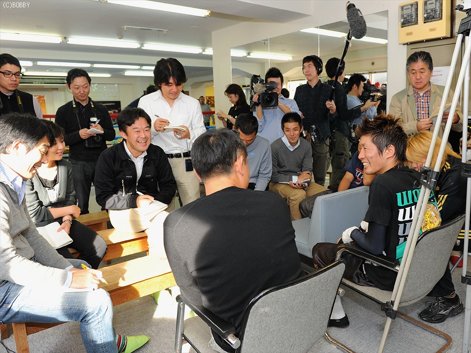はじめに会見を開いた佐藤は、当日の試合を中継するテレビ東京にコンディションを尋ねられ「手を変え品を変え、日々スパーリングをしています。トレーナーによると、もう200ラウンドを超えているようですね(笑)。いつでも試合ができますよ!!」と"スパーリング漬け"の毎日を笑顔で語った。