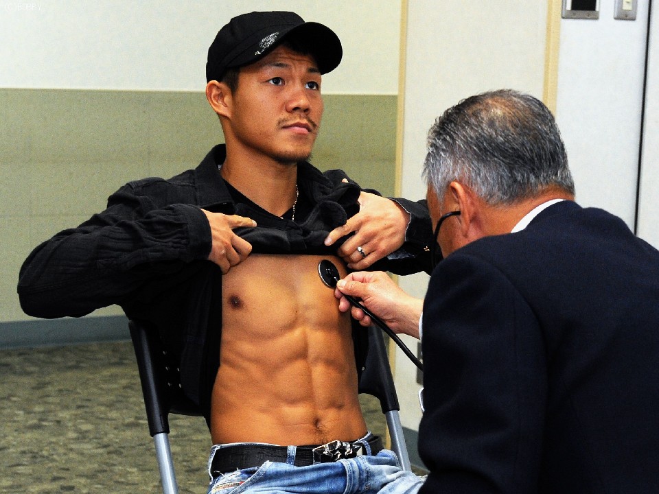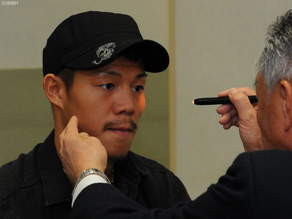 対戦相手が2度変更になるアクシデントもあったが、課題のサウスポー対策とコンディション作りも順調の様子で、興毅は余裕の表情で検診会場に姿を現した。