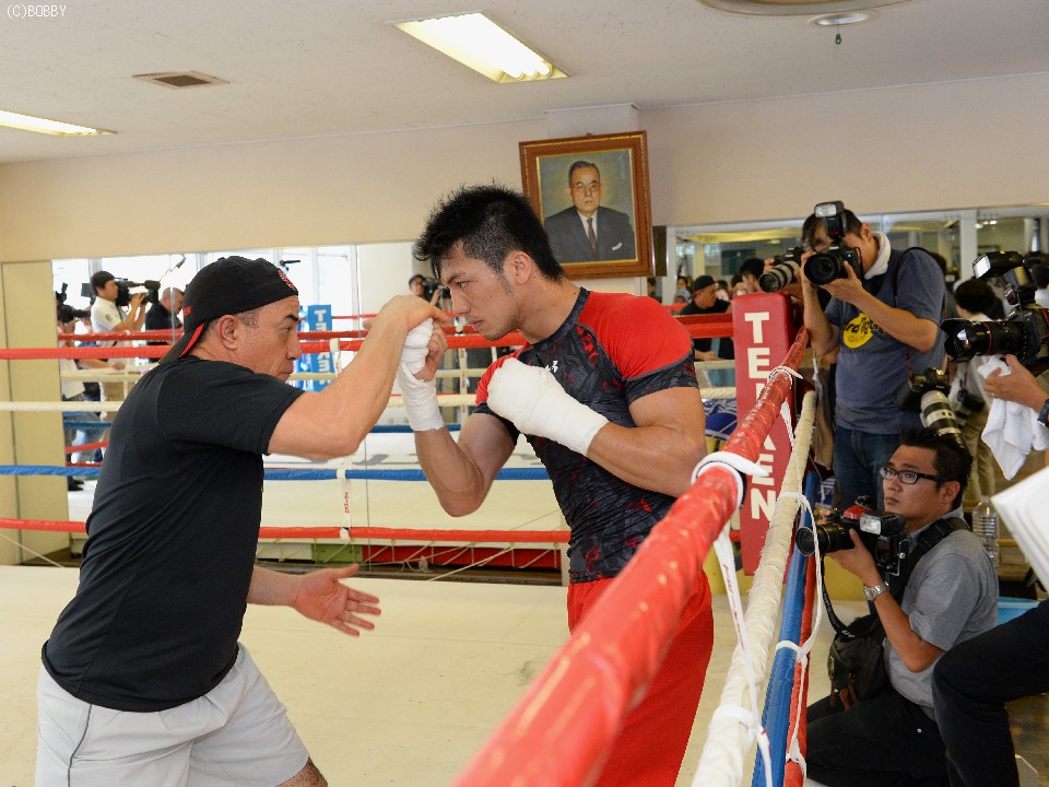 スパーのあとサラス・トレーナーとのミット打ち、パンチングボール、ロープ跳び、シャドーなど、この日は計1時間半近いトレーニングを披露した。一連の練習を間近で見た帝拳ジムの浜田代表は「1年前と比べてボクシングの幅が格段に広くなっている。以前は接近してからボディを打っていたけれど、いまは接近する前から打てる。左ジャブ、右ストレート、そしてサイドに出て左フックのボディブローを打つなど、これまでにない攻撃ができるようになった。この短期間で多くのことを身につけた」と感心しきりだった。