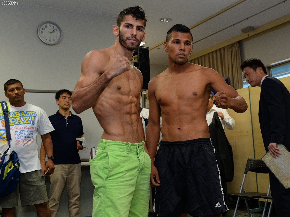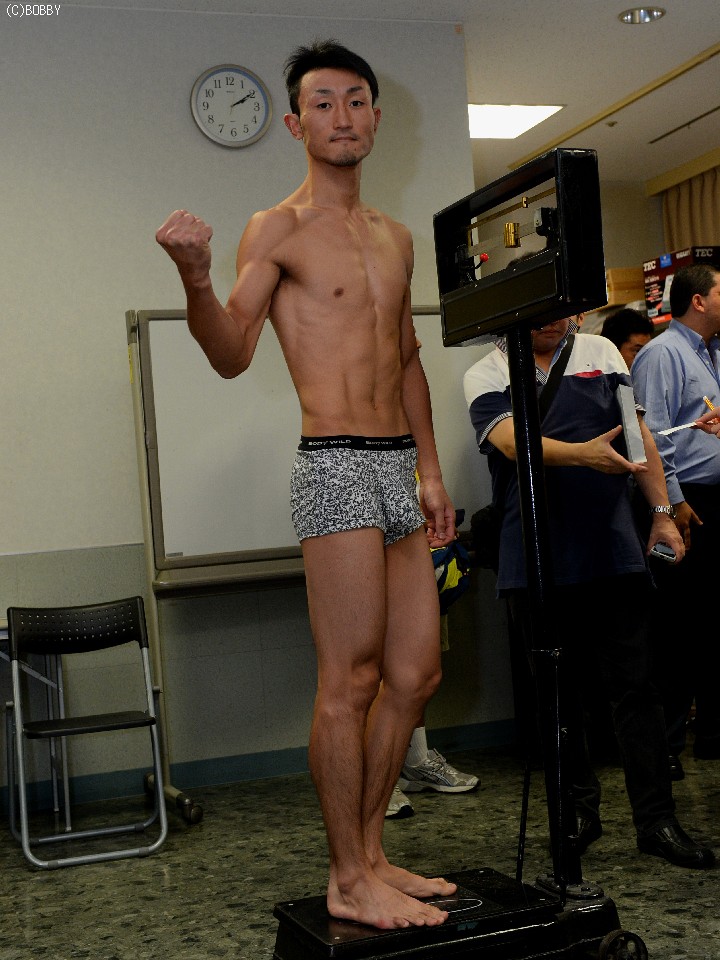 小原はスーパーライト級リミットちょうどの63.5キロでパス。続いて秤に載った竹中は200グラムの余裕をもって63.3キロでクリアした。戦績は6連続KO中の小原が9戦8勝(7KO)1敗。5連勝中の竹中が24戦18勝(8KO)6敗2分。