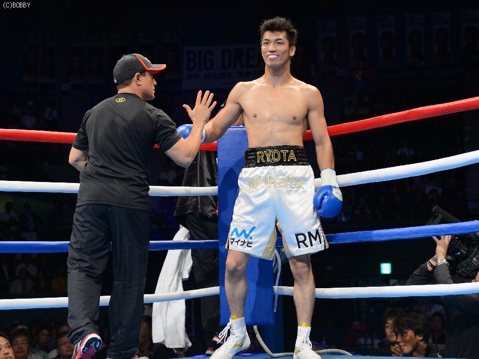 試合後、村田は疲れも打たれた様子もなく、余裕の表情で共同インタビューを受けた。「まずはプロのリングで勝てたということに、ホッとしています。練習でやってきたことの全部を出せたわけではないけれど、デビュー戦で東洋太平洋チャンプを2Rで倒して勝ったので80点は(自分に)あげてもいいでしょう。試合前はアマチュアと違って、薄いグローブで打たれるとさすがにダメージがありました」余裕の表情で試合をしているようにも見えたが「余裕があるから笑っているとかではなく、相手のパンチが少し当たったときに、相手に効かないよということを伝える意味で、心理戦の一環としてそういう表情をしていました」と、今度は本当の笑顔で答えた。最初のダウンについては「柴田選手が下がったときにタイミングよく右が当たった。長く、ベストの距離で当たると相手に効くのが分かってよかった」と、確かな手応えを得た様子だった。