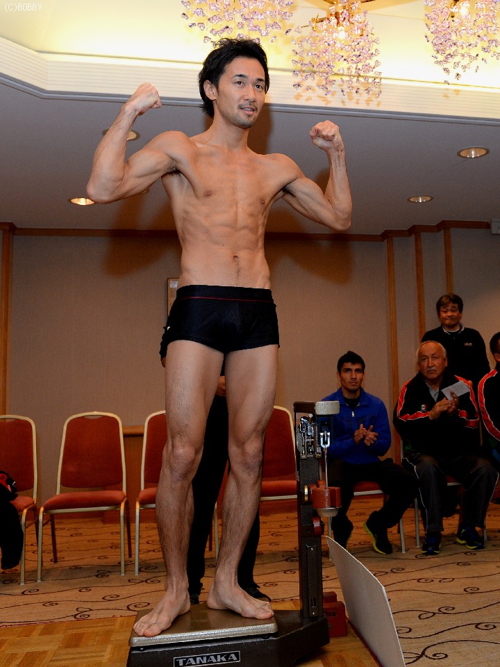 ゆっくりと慎重に秤に上がった山中は、バンタム級リミットの53.5kgで一発クリアし、この瞬間ようやく笑みがこぼれた。続いて挑戦者は、余裕の53.3kgと200gアンダーでパス。計量後は、カメラマンの要望で約20秒ほどの睨みあいとなり、この時ばかりはゲバラも初めてボクサーとしての顔を見せた。