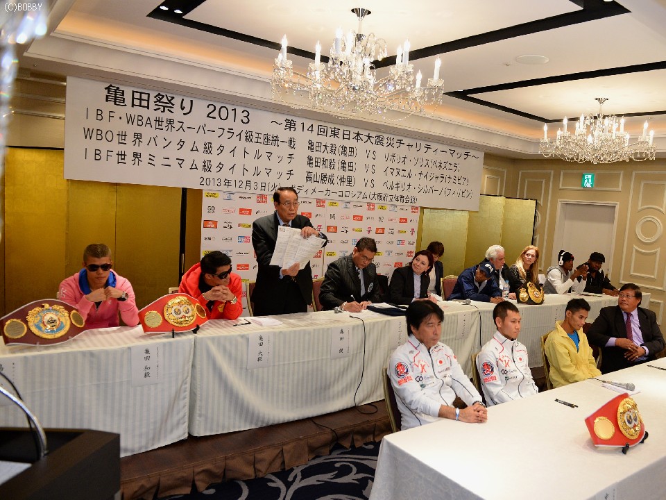 今月3日、大阪・ボディメーカーコロシアムで開催される「亀田祭り2013」IBF、WBO、WBAメジャー3団体がそろうトリプル世界戦の調印式が1日、大阪市内のホテルで行われた。