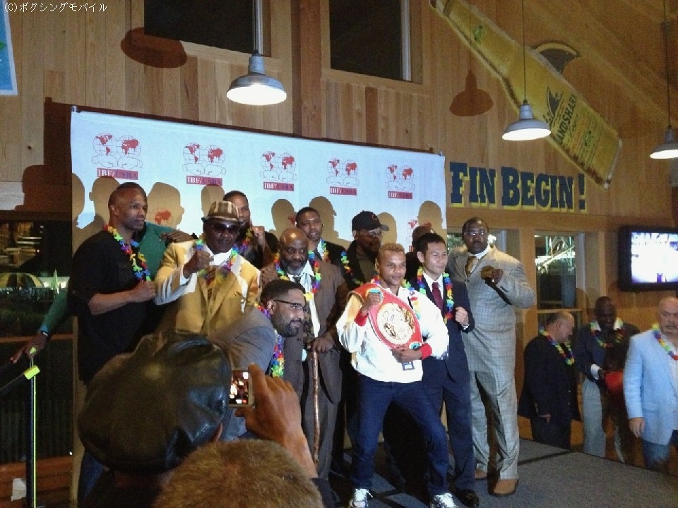 メイウェザーやパッキャオらが注目させた階級とあって、日本チャンピオンだと紹介されると大物選手たちと記念撮影会が始まった。