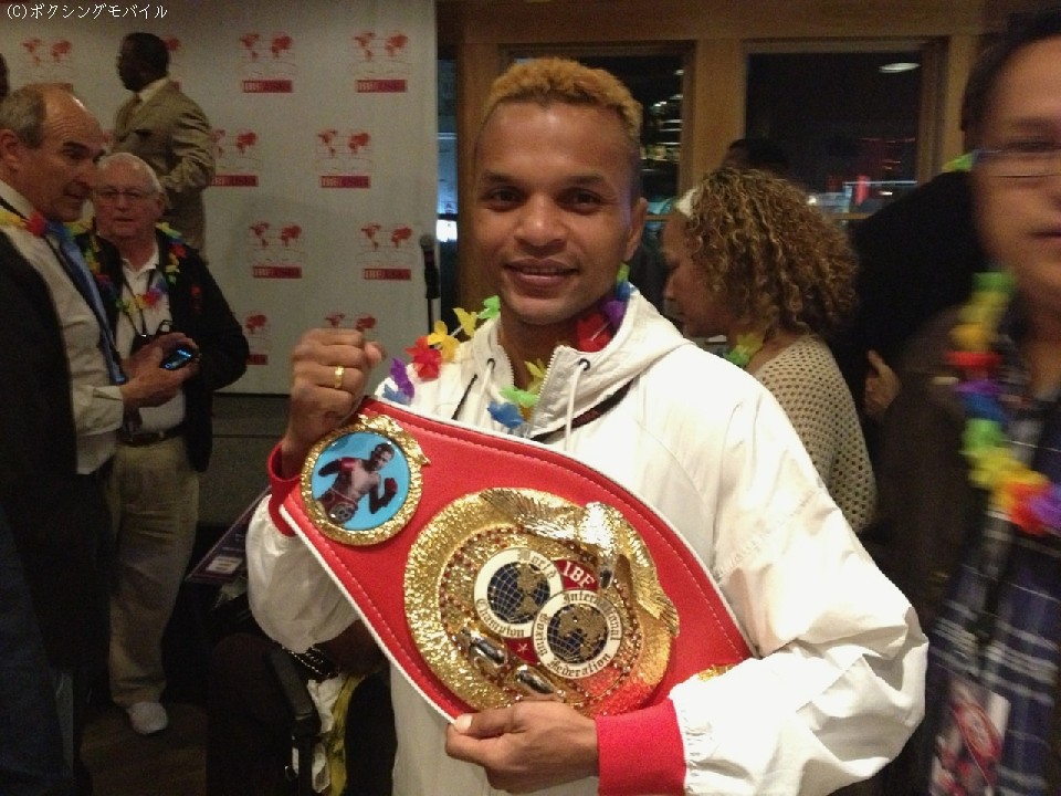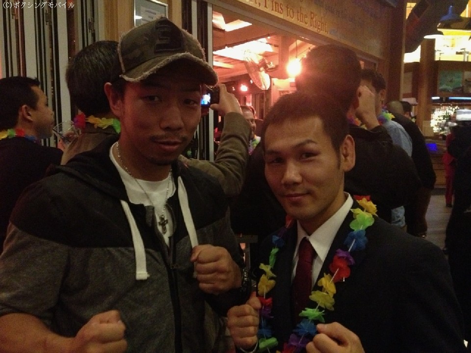 米国アトランティックシティーで18日より開催されているIBF総会。現地時間19日の夜には、立食パーティーが行われ、今月7日に王座防衛に成功したミニマム級現役チャンピオンの高山勝成(仲里)とフライ級のアムナット・ルエンロエン(タイ)がステージに上がると関係者から祝福された。