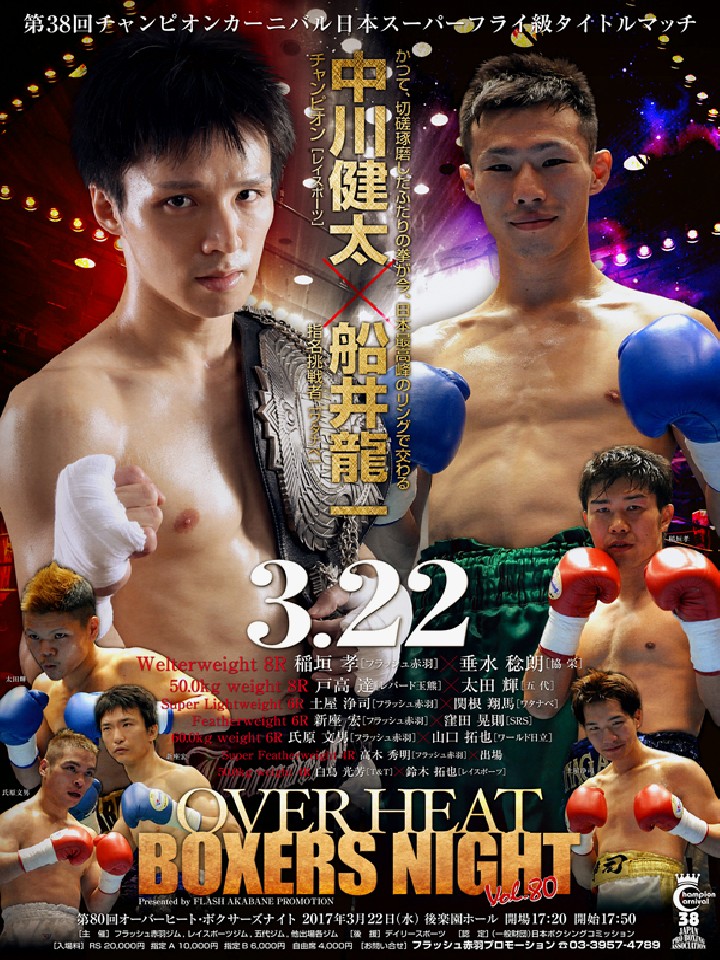 注目:ワタナベジムの木村隼人と拳を交えた昨年10月の日本王座決定戦で、初戴冠を果たした中川の初防衛戦の相手は、木村と同門の船井。船井はタイトル挑戦の経験もある実力者。