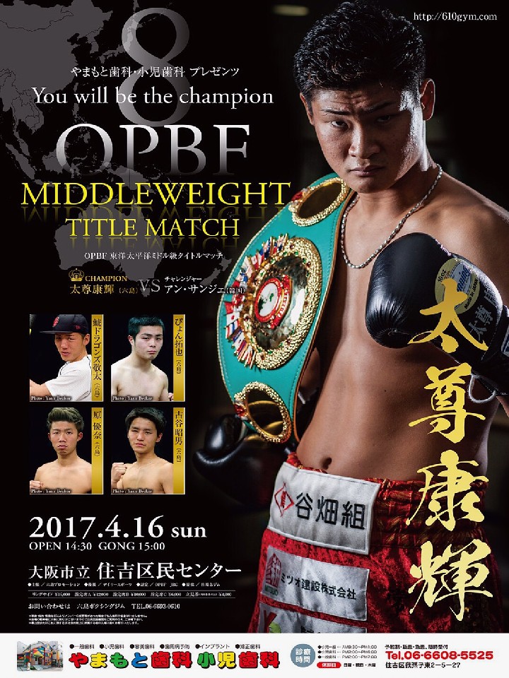注目:ミドル級で世界を目指す大尊康輝(六島)。190cmの長身サウスポーは、一歩ずつ着実に成長を続けている。東洋太平洋王座獲得から約5ヶ月。チャンピオンとして向かえる初防衛戦。何に重点を置くのか?KO勝利か防衛成功か。