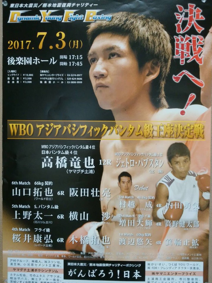 注目:同王座は、4月に英国でゾラニ・テテ(南アフリカ)とWBO世界バンタム級暫定王座決定戦を争ったアルツール・ビルネエバ(比)が返上したもので、勝者はタイトルとともにWBO世界ランク入りが濃厚。38戦28勝(9KO)4敗6分のパブスタンは世界挑戦経験を持つ実力派のサウスポーだが、10年選手の高橋も37戦26勝(19KO)6敗5分とキャリアでは引きを取らず、加えて益田戦以降2年半負けなし。キャリアに裏打ちされた実力を発揮できれば初のタイトル獲得も十分にありそうだ。
