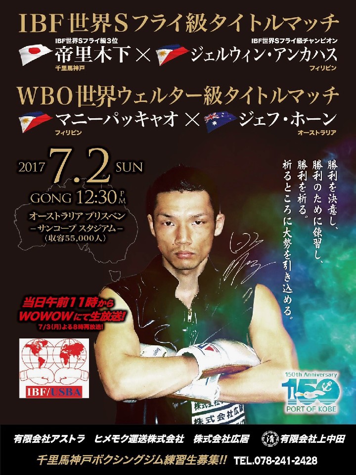 注目:軽量級随一の激戦階級スーパーフライ級で、2度目の世界挑戦が決まった帝里木下(千里馬神戸)。オーストラリアでフィリピン人世界チャンピオンに挑む。