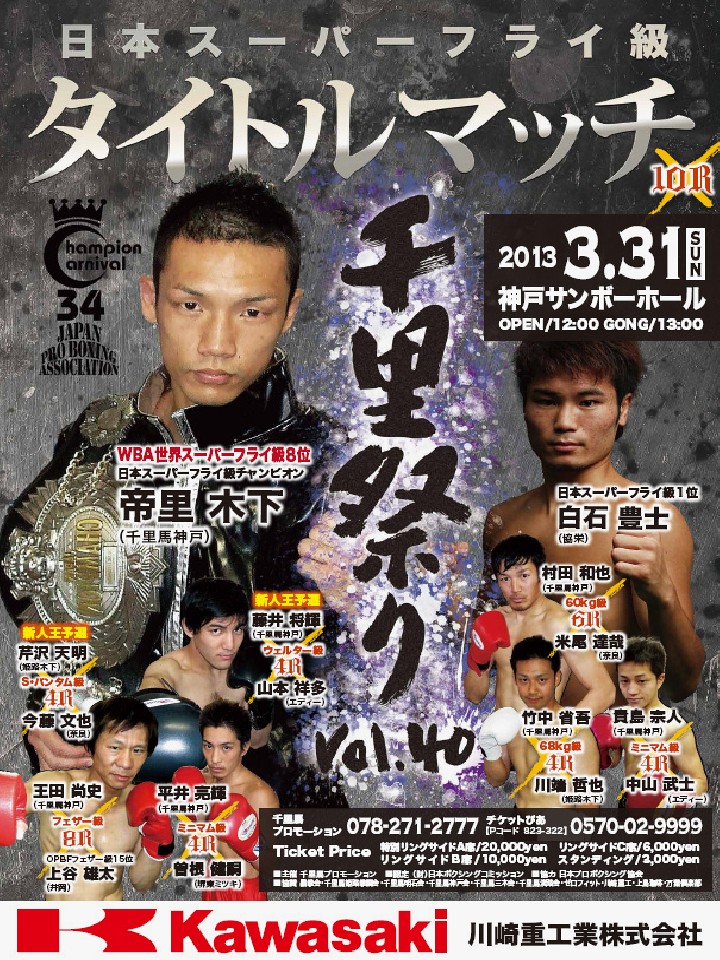 注目:王者・帝里のV3戦。サウスポー帝里は2度の防衛戦、打撃戦の展開に巻き込まれるも、僅差判定でベルトを死守している。一方、指名挑戦者・白石は、豊富なスタミナと手数で接近戦を得意とするブルファイター。帝里が自分自身のスタイルを貫けるのか、それとも白石が"坂田2世"の本領を発揮するのか…。