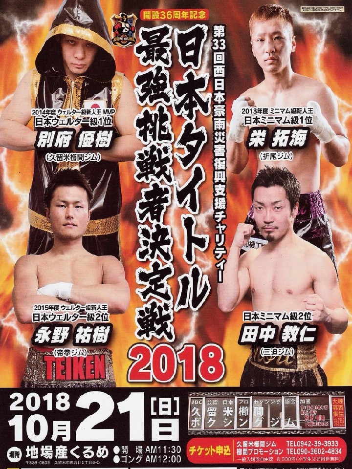 注目:ともにタイトル再挑戦を目指す。栄は2016年12月に当時ノーランカーだった平井(千里馬神戸)に負傷判定負けを喫したが、それから5連勝と復調。一方の田中は4月にOPBF東洋太平洋王座に挑戦して以来の再起戦。小浦(E&Jカシアス)との一戦では初回にダウンを奪い前半ポイントでリードしていたが、5回に逆転KO負けで涙を飲んだ。試合は田中は先に仕掛け栄が迎え撃つ展開が予想される。