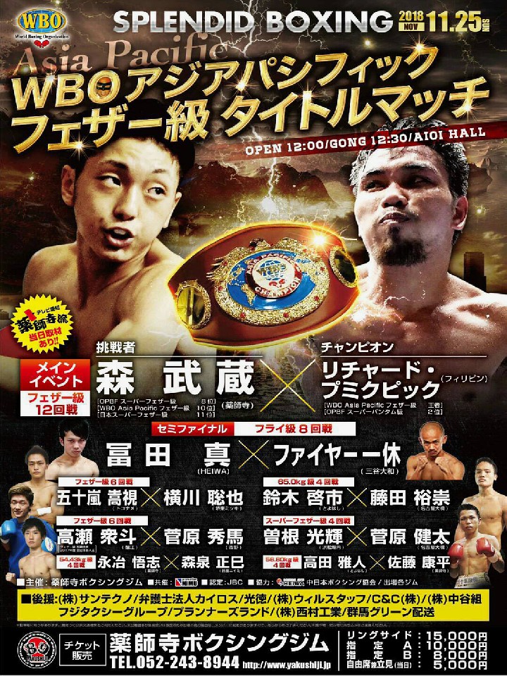 注目:中部期待のサウスポー森が、ベルトと世界ランクを狙う一戦。森は16年12月に17歳でプロデビューすると、5戦全勝4KOで昨年の全日本Sフェザー級新人王(技能賞)に輝いた。今年7月の前戦では、比国王者のアラン・バレスピン(比)に判定勝ちし、OPBF東洋太平洋ランク入りをはたした。今回、無傷の8戦目でタイトル初挑戦となる。王者のプミクピックは31戦21勝(6KO)8敗2分。天笠尚(FLARE山上→引退)との決定戦を制し、今年4月には、現日本ユースSフェザー級王者の木村吉光(白井・具志堅)を判定で下し初防衛に成功した。今回が2度目の防衛戦となる。ラフファイトを得意とするが、ディフェンス力があり、12ラウンド戦えるスタミナも証明済み。森は初のフェザー級での試合、初の12ラウンドと未知数な部分は多いが、伸びしろに期待したい。
